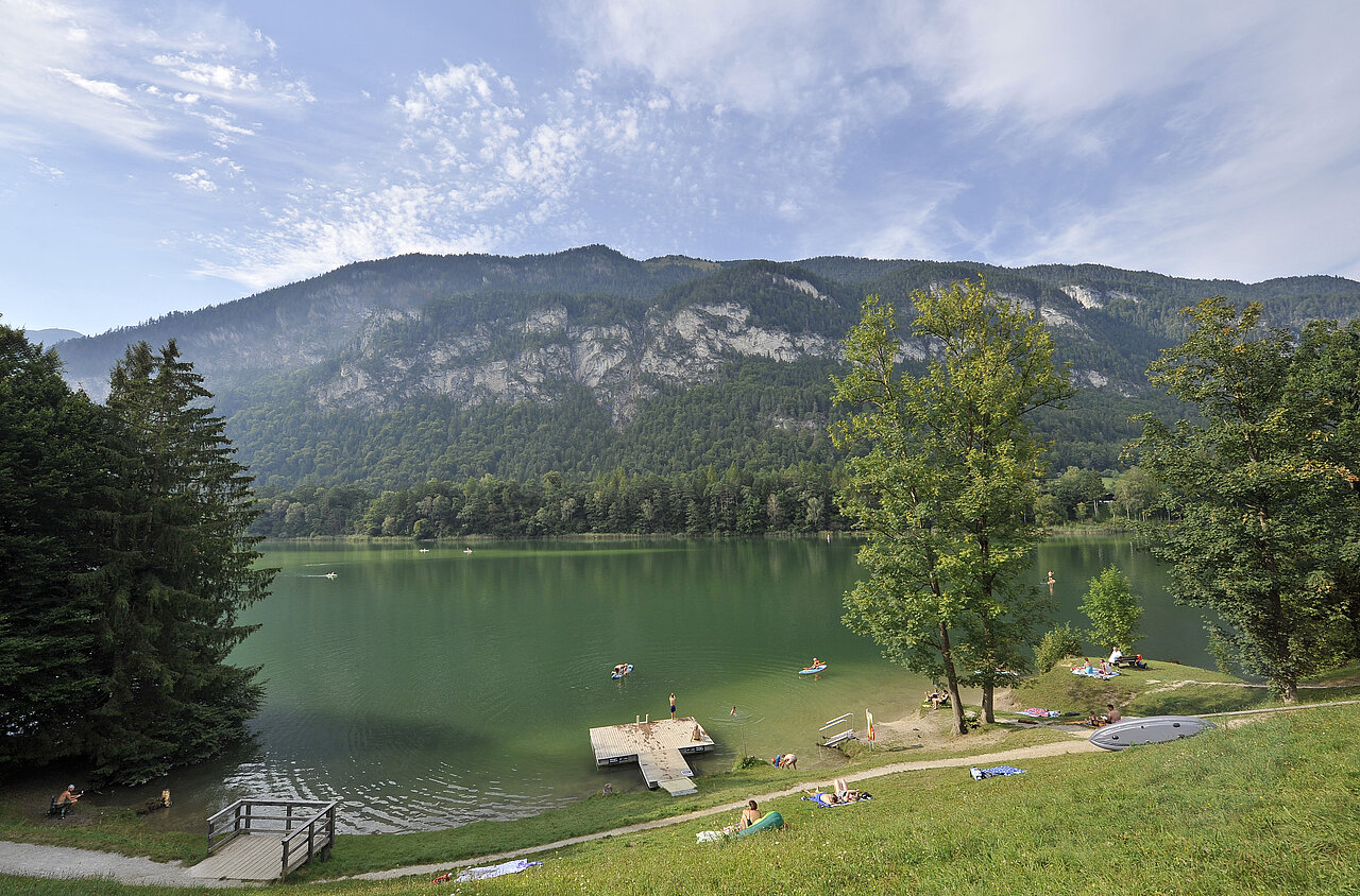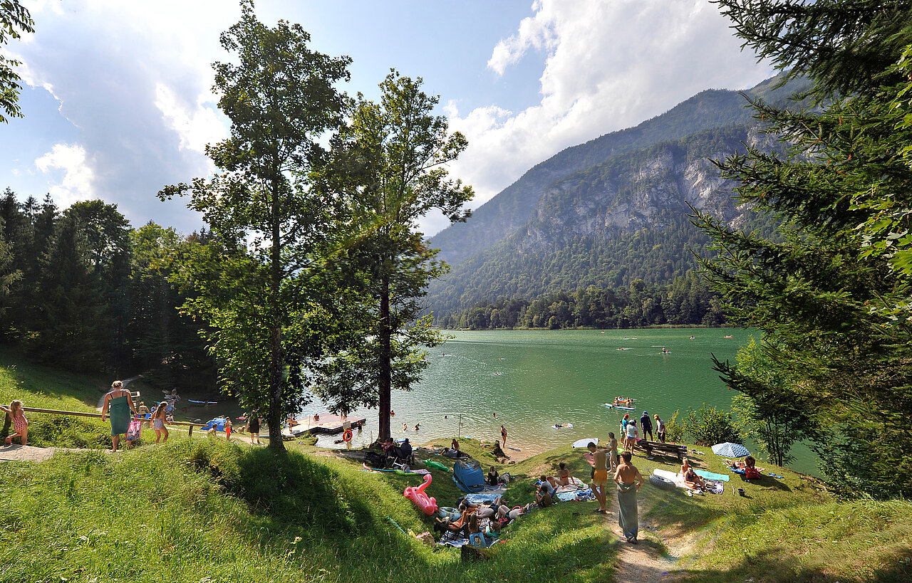 Nur wenige Schritte vom Platz entfernt befindet sich ein kleiner, naturbelassener Seezugang. Umgeben von Grünflächen und mit einem wunderschönen Blick auf die Bergkulisse bietet dieser Bereich eine schlichte, authentische Möglichkeit, ins klare Wasser des Reintalersees einzutauchen oder ein paar gemütliche Schwimmzüge zu machen. Ein feiner, unaufgeregter Zusatzzugang – direkt am Campingplatz und kostenlos für unsere Gäste.